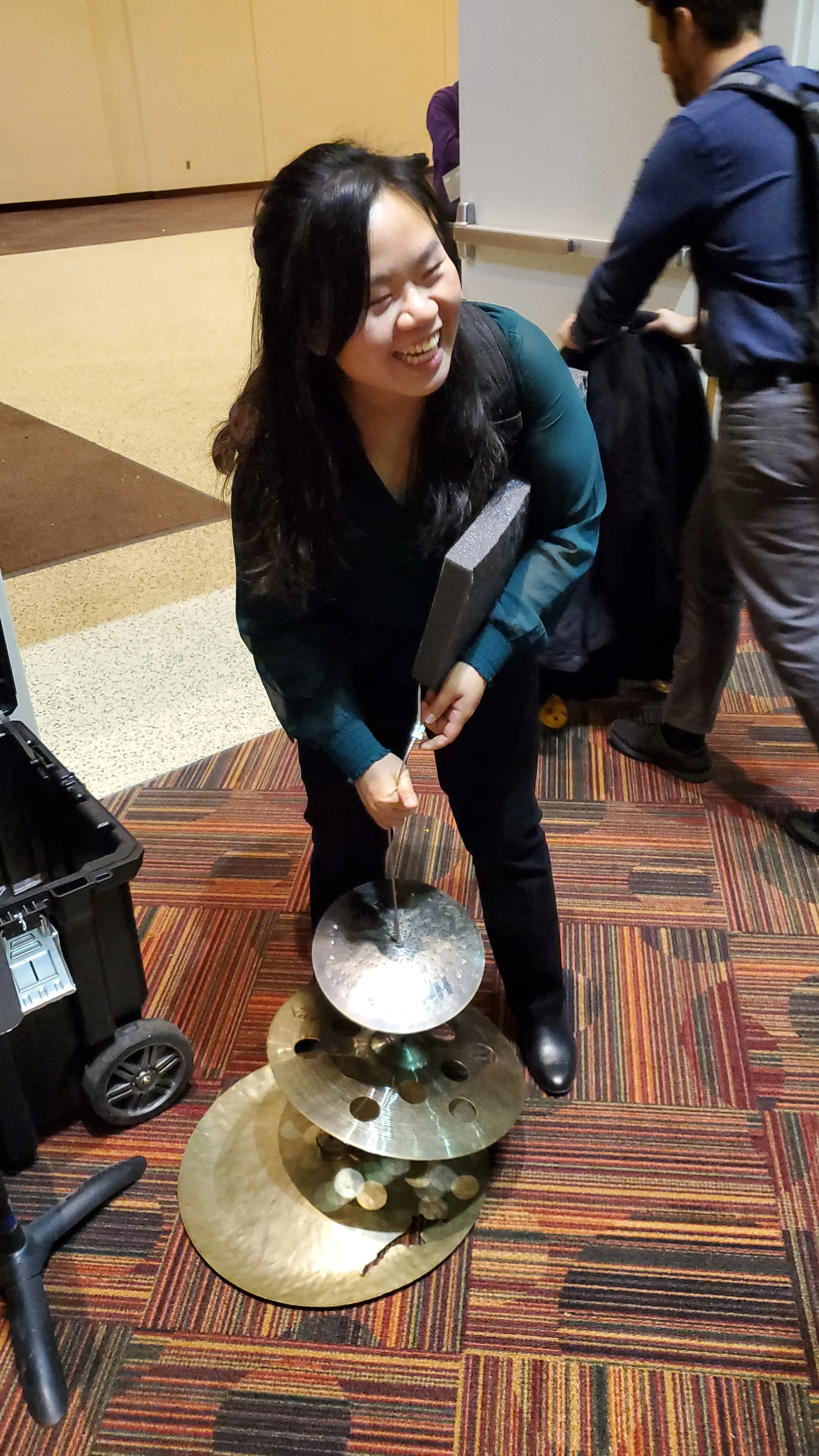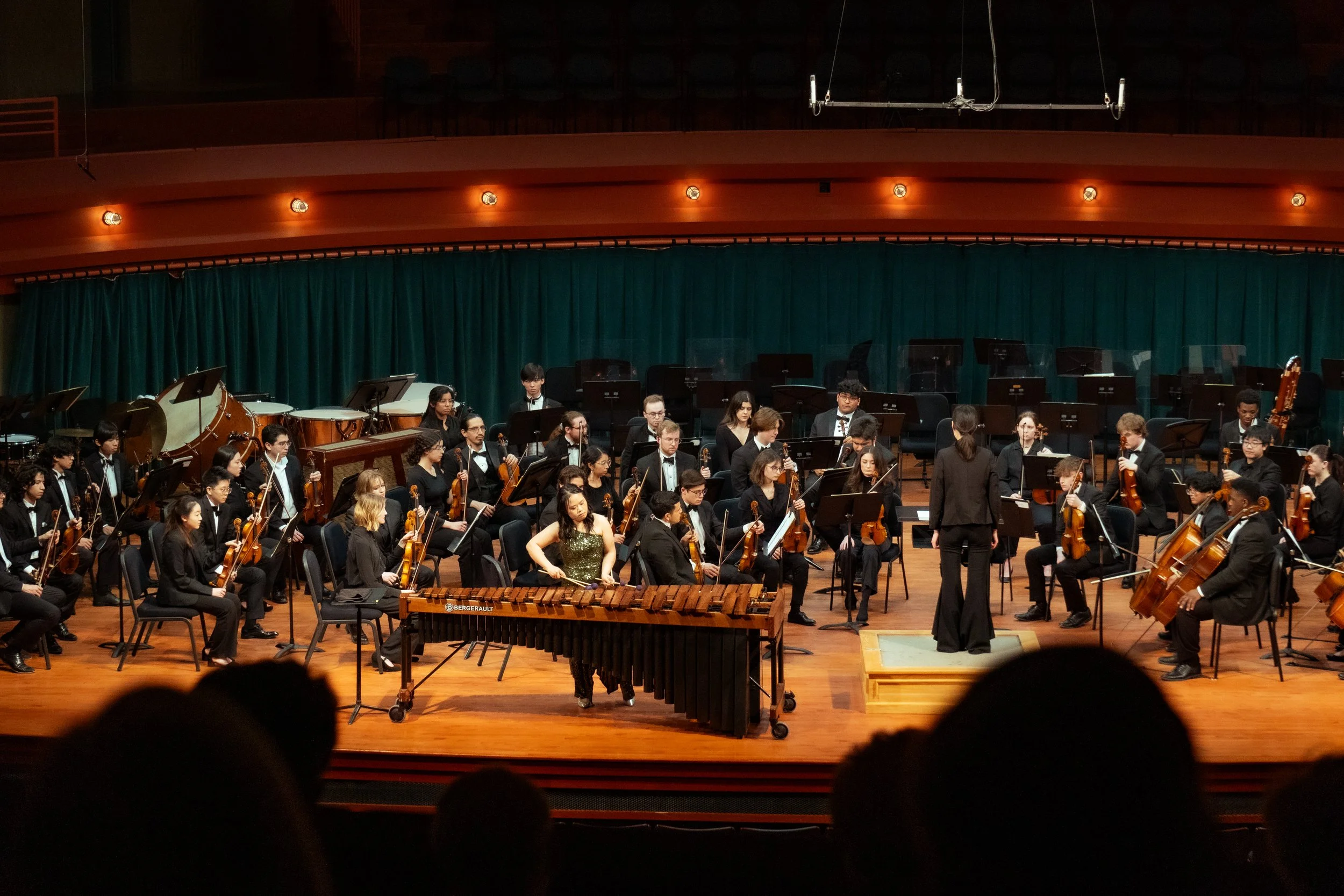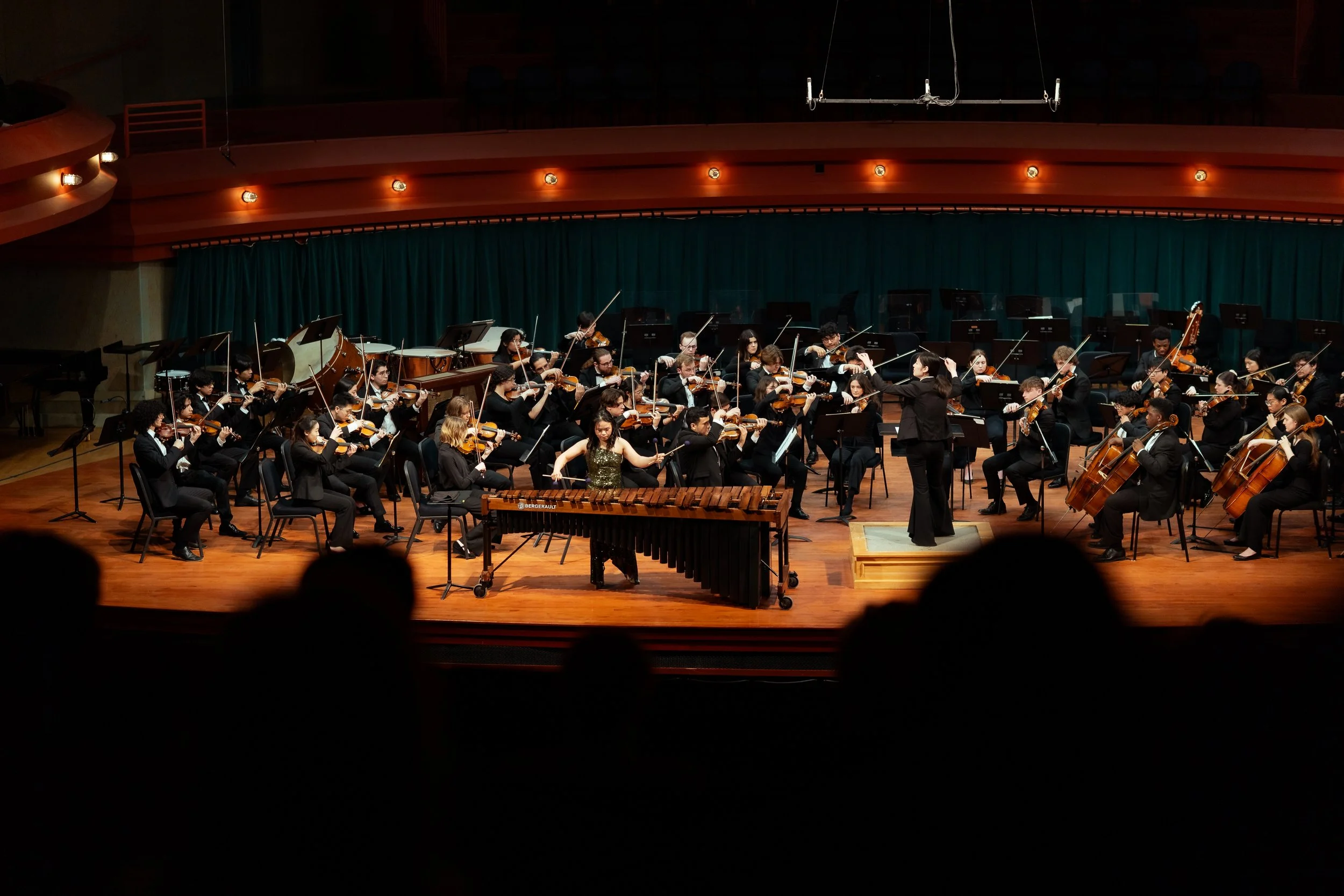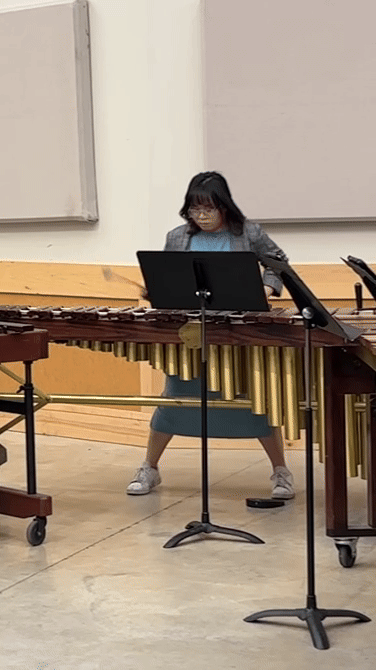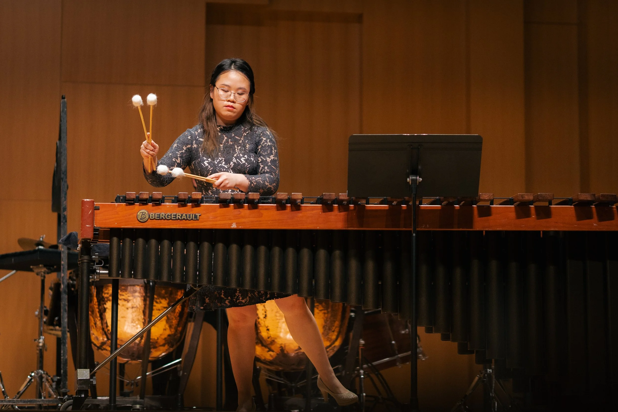 A woman playing a marimba on stage, with percussion instruments in the background.
