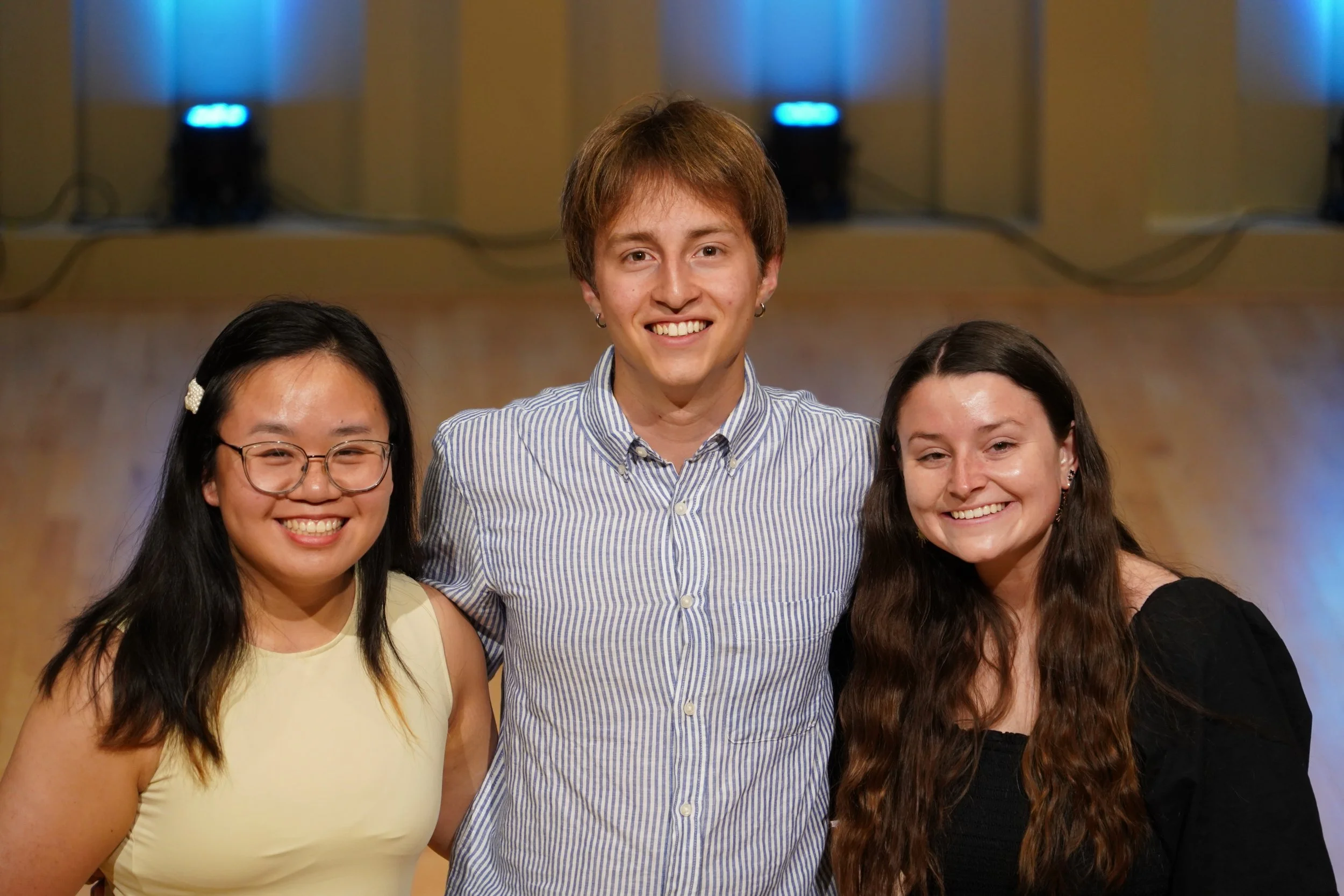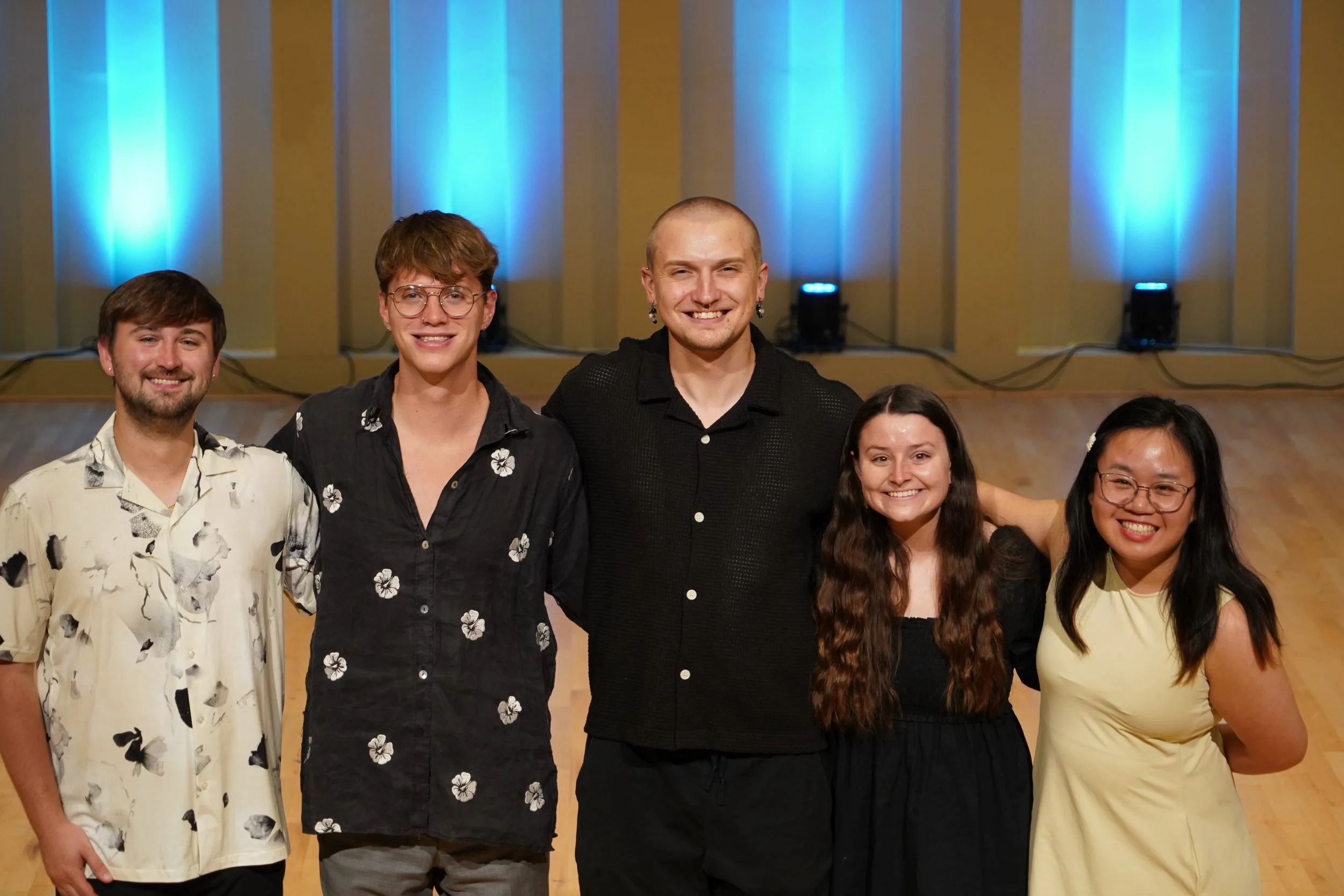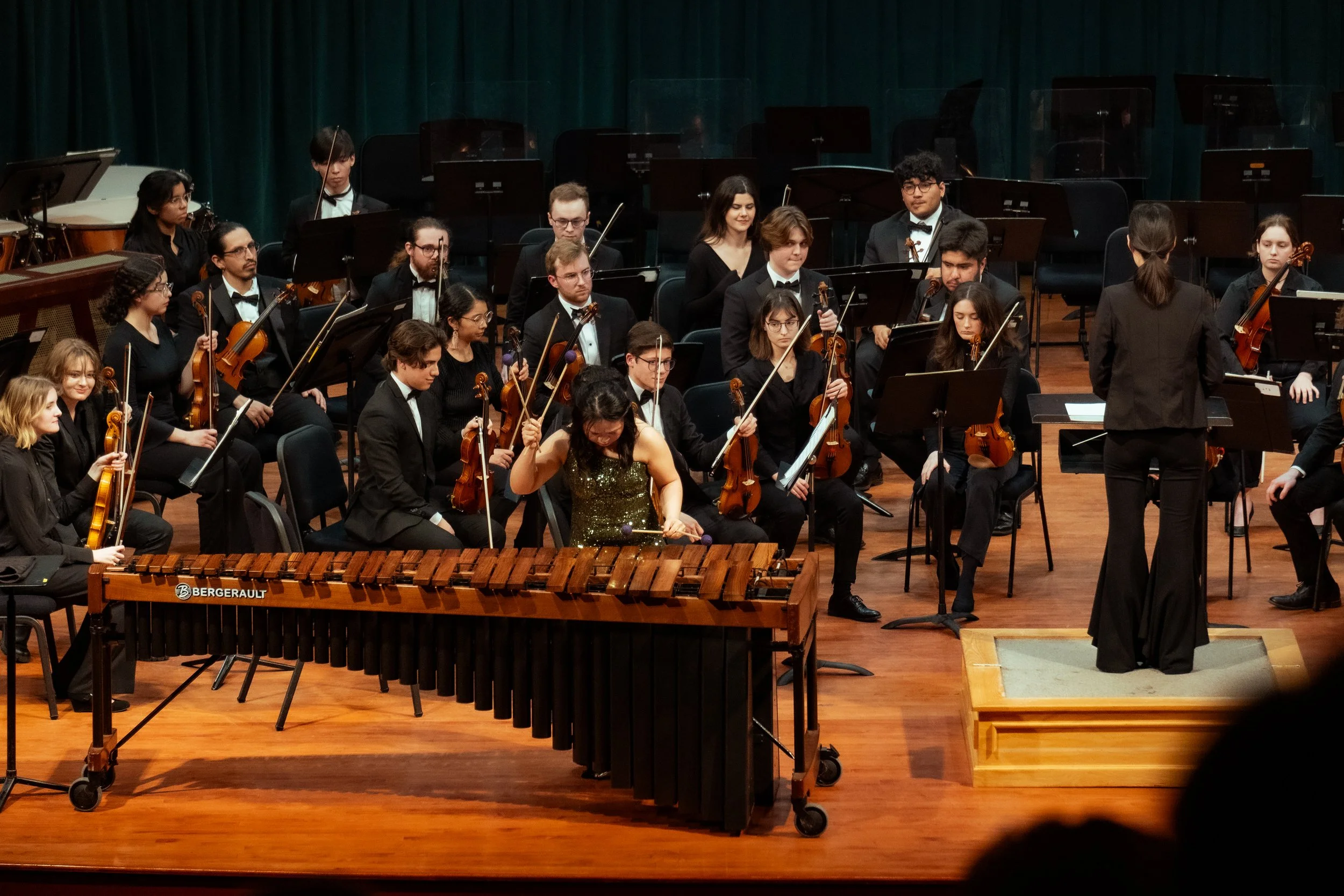 Orchestra performing on stage with conductor. Musicians playing string instruments, a pianist, and a percussionist with a xylophone. Green curtain backdrop.