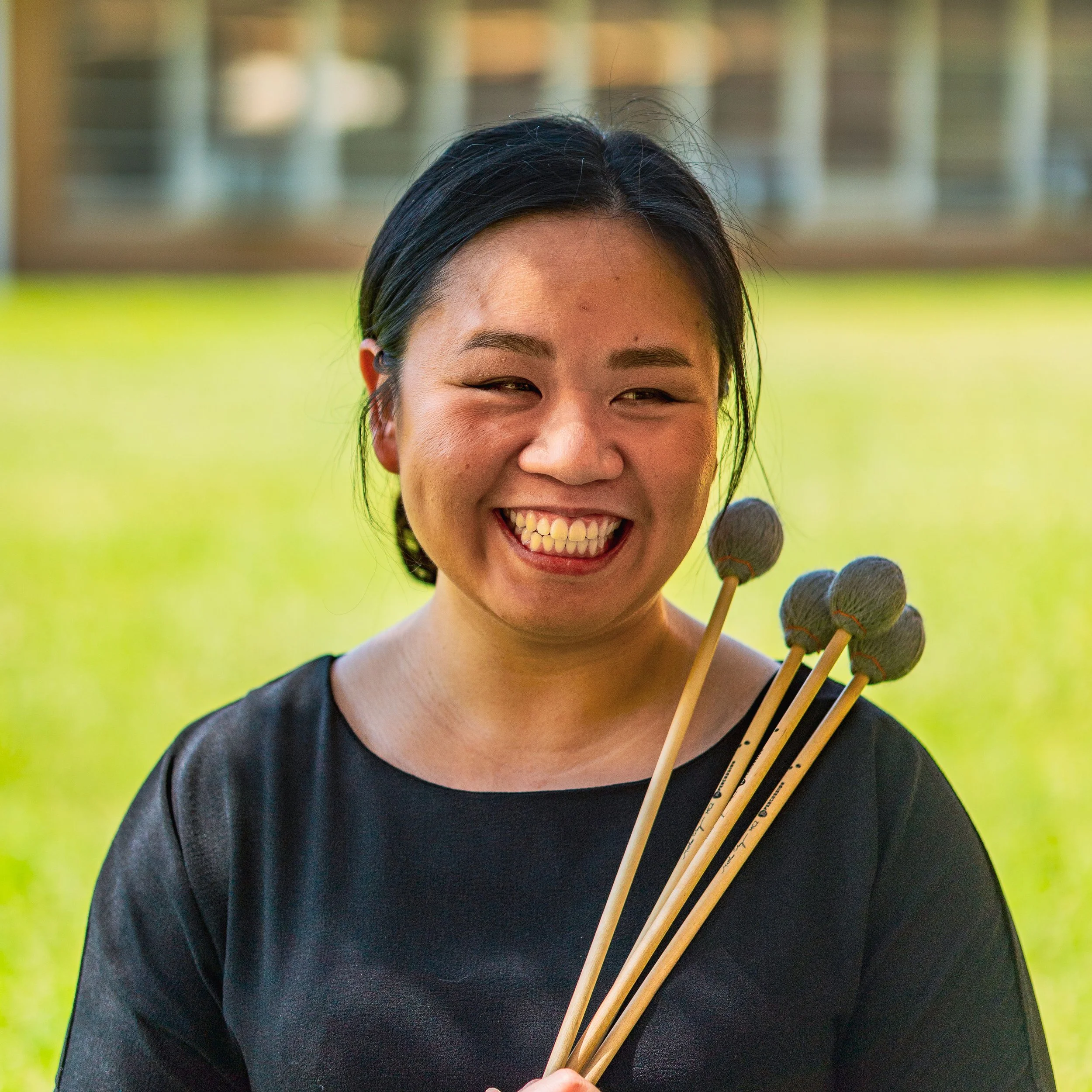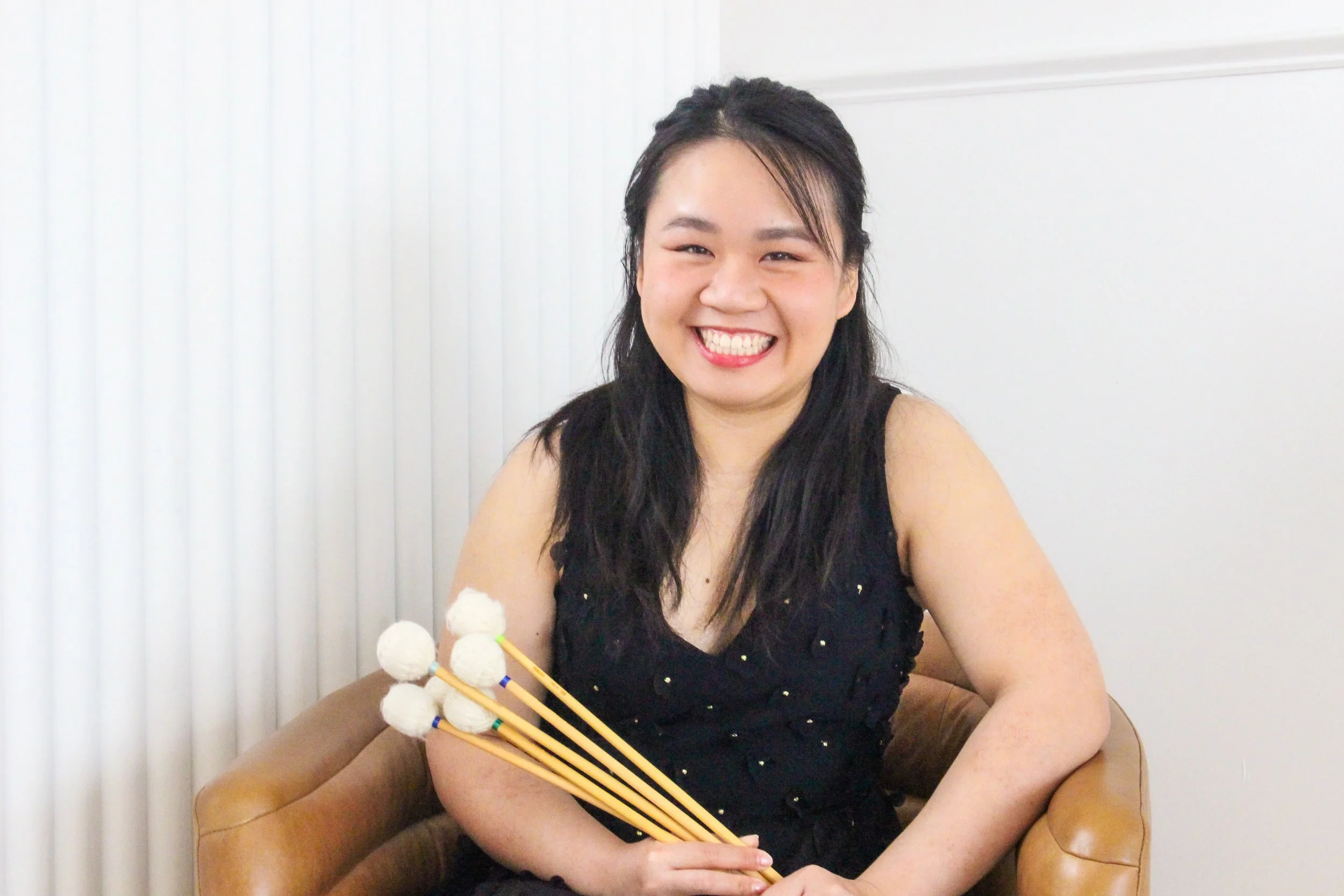 A young woman with glasses and shoulder-length black hair playing a xylophone, holding mallets, wearing a black top with decorative shoulder straps, in an indoor setting with a window and a staircase in the background.