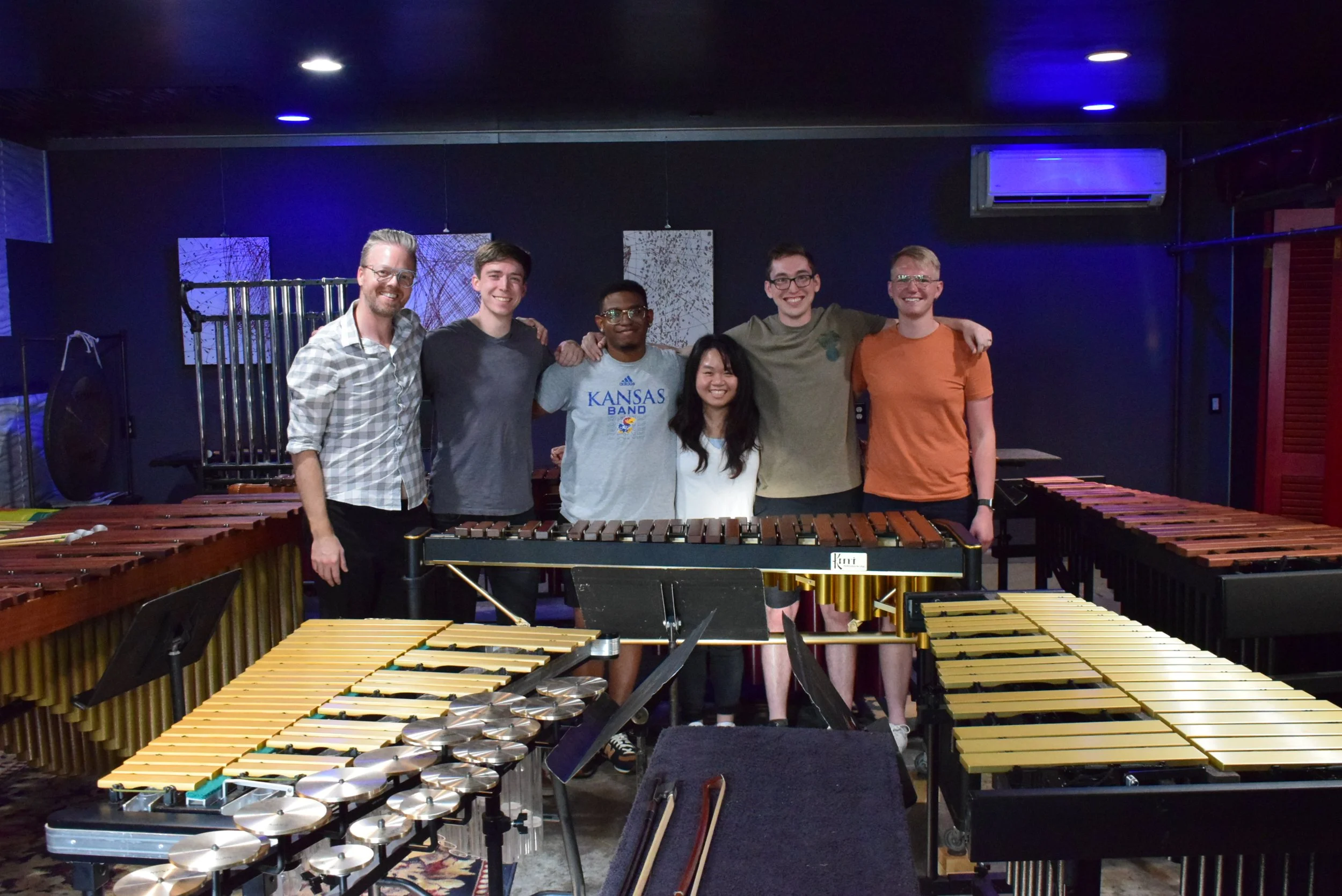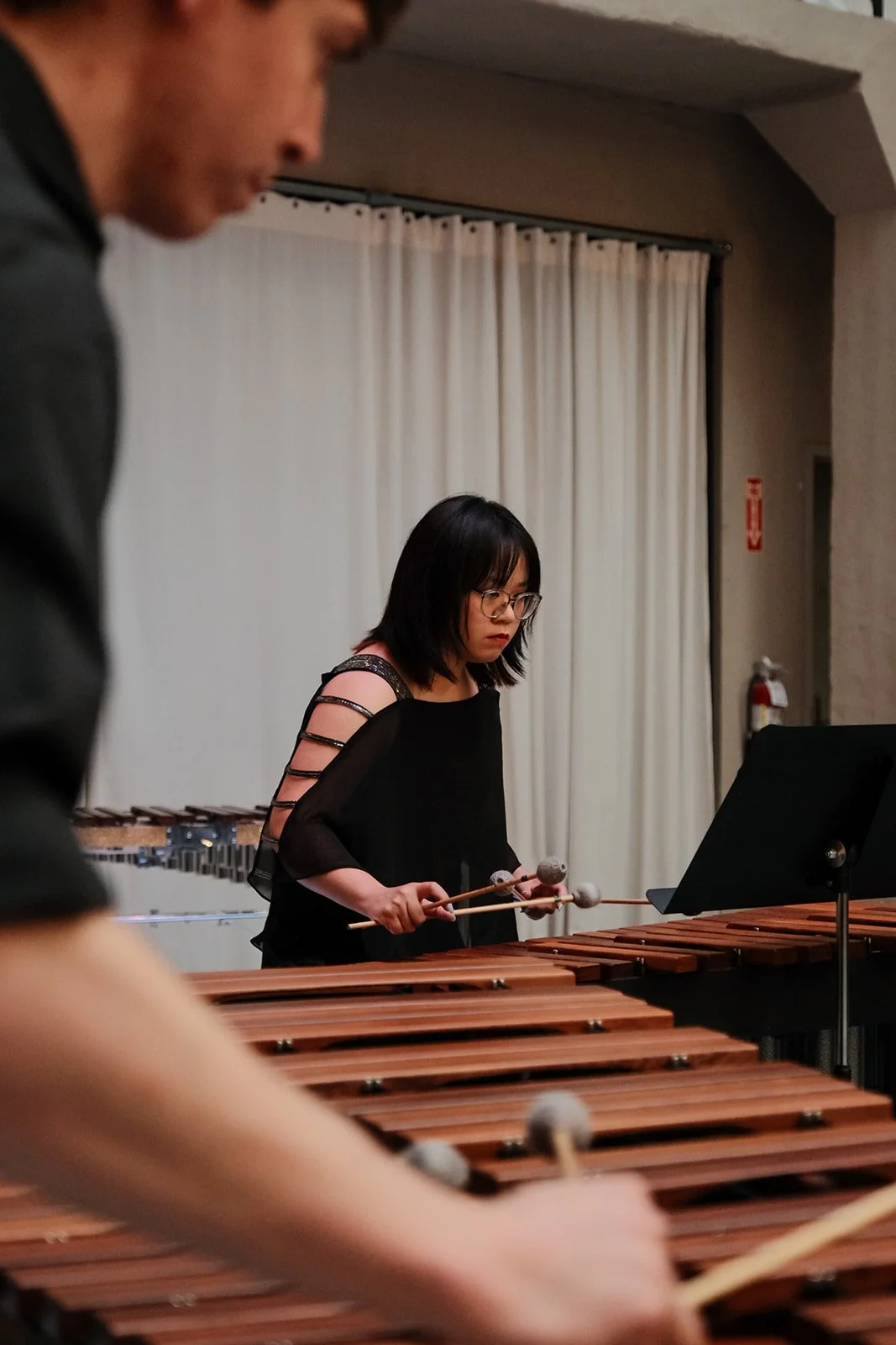 Two musicians playing marimbas in a practice room, with one woman focused on her music and another partially visible man also playing.