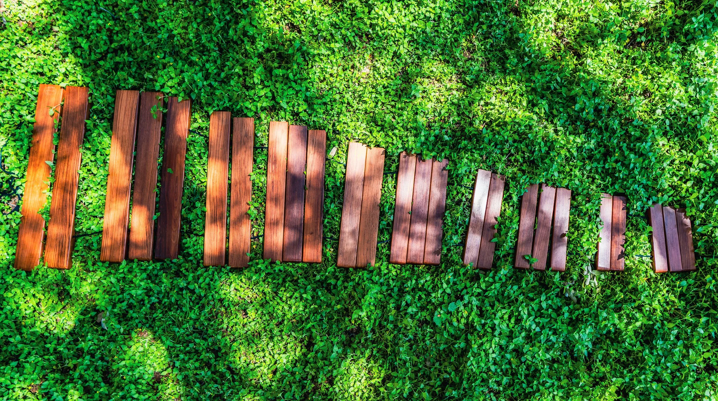 A wooden bench placed on green grass with small plants and shadows from nearby trees.